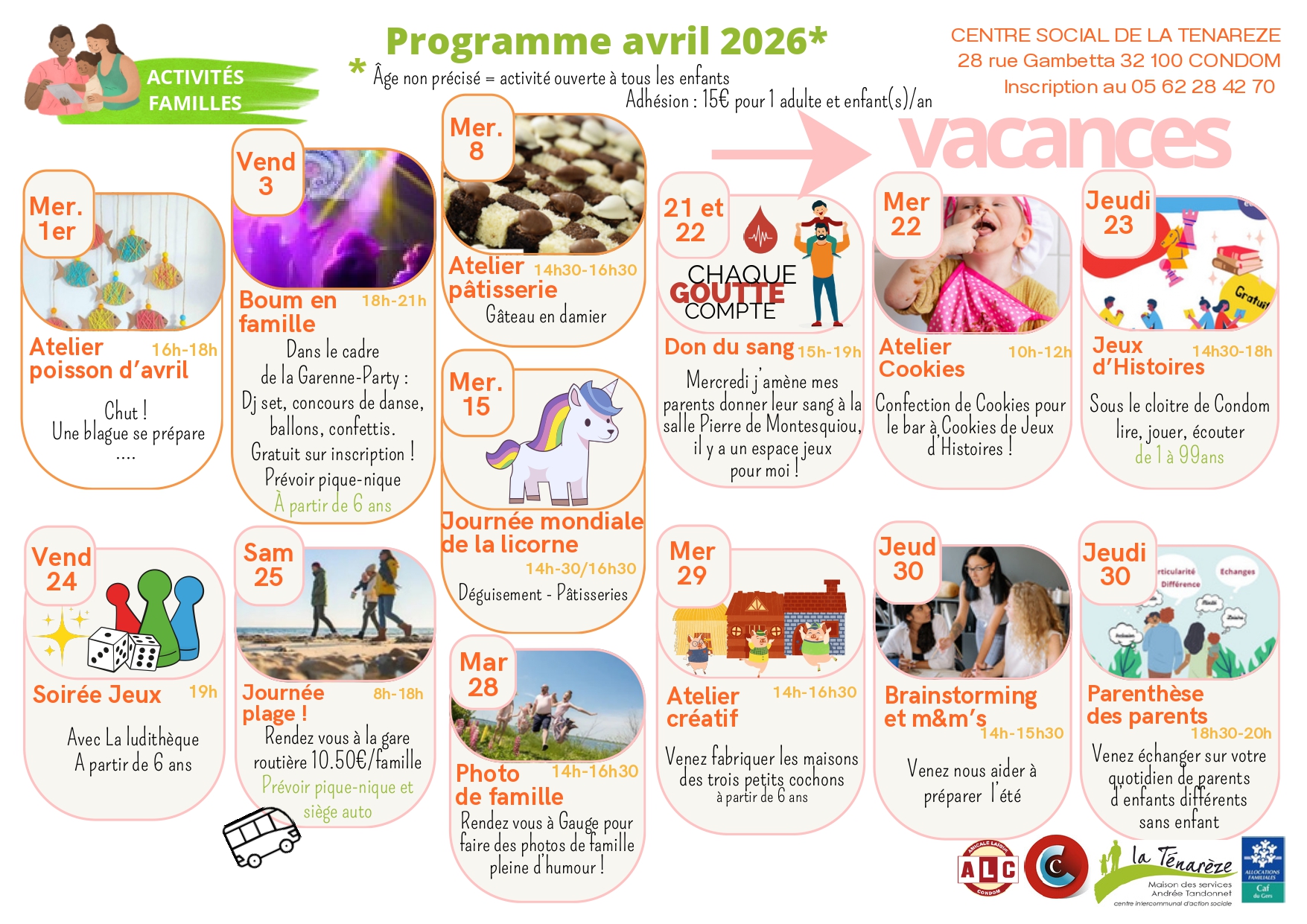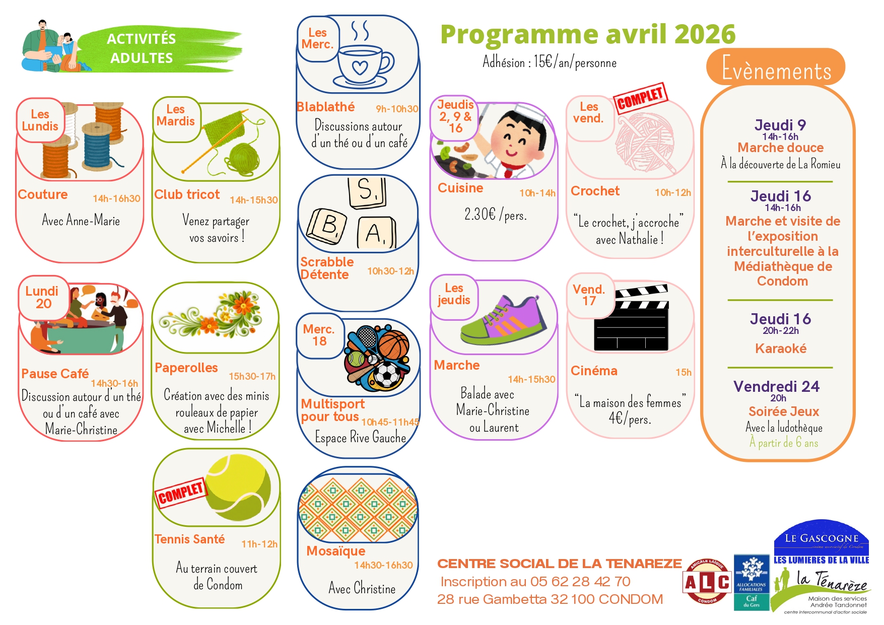 Retrouvez les activités proposées par le Centre Social de la Ténarèze pour le mois d'Avril Des activités pour tous les âges, des moments pour tous les goûts !